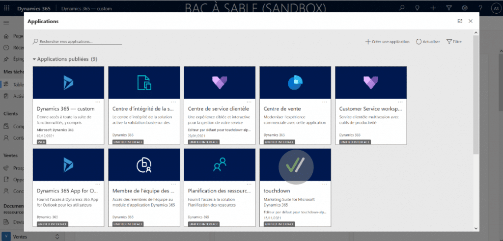 Afin d’utiliser Touchdown vous devez vous connecter sur votre Dynamics 365 et accéder à votre environnement :