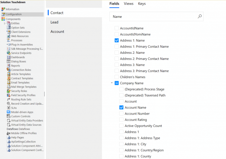Choose visible views and fields within Touchdown interface corresponding to each entity.